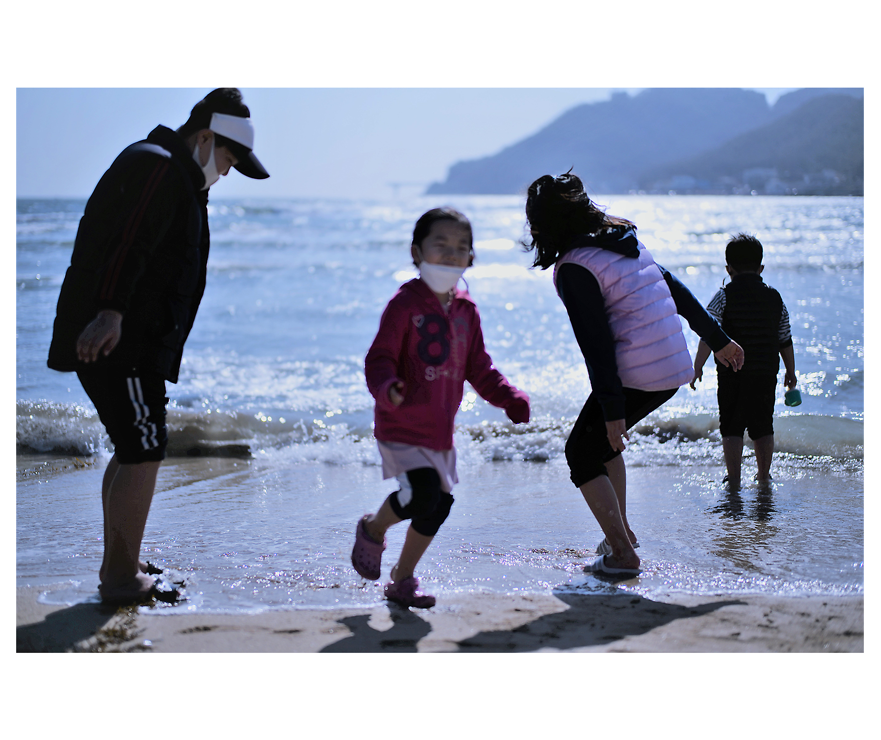 해안에서 밀려드는 파도를 보며 즐거워하는 모습을 카메라에 담았다.